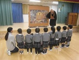 「成道会」とは、おしゃかさまがお悟りを開かれた日、12月8日をお祝いして行う行事です。本年は12月8日が土曜日のため、前日の7日に行いました。当日は全員ホールに集まり、まずは年長組の担任と園児でろうそくのあかりをお供えしました。その後、手を合わせ、「仏の子ども」を歌いました。引き続き、「成道会」を歌い、おしゃかさまのお悟りについてのお話を聞いた後、その様子を伝えるビデオを見ました。クラスごとにおしゃかさまがお悟りを開かれた姿を描いた掛図を見た後、保育室に戻り、村娘スジャータが修行中のおしゃかさまに乳粥を献じたという逸話にちなみ、お供えした「飲むヨーグルト」をおやつとしていただきました。