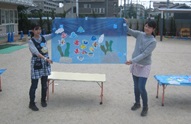 年長、年中、年少組が一緒に活動するのがたてわり保育です。当日、初めに行ったのが「水族館を作ろうリレー」。1回目は年長と年中が、2回目は年長と年少が二人一組となり、4チームに分かれて行いました。力いっぱい走りたい気持ちをぐっと抑え、相手の走り方に合わせている子や、「がんばろうね」と声を掛けている子、あるいは大事に握りしめてきた、自分たちが描いた魚、イカ、タコをどこに貼っていいのか困っていると、貼る場所を教えてあげている子もいました。できあがった水族館には海草が揺らめく中、いろいろな形や色をしてさかな、イカ、そしてタコが泳いでおり、思わず園児達から拍手が起きました。最後に、全員で「はとぽっぽ体操」を踊り、たてわり保育を終えました。