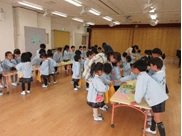 年長組が交代でお店屋さん、全学年が順番にお客さんになり、ホールでお店屋さんごっこを行いました。商品はみんなで作った「けん玉」「リボン」「こま」など。お客さんはそれぞれ自分で作った紙の財布に厚紙製の100円、500円硬貨を入れ、買い物に出かけます。ゆっくりと商品を見ながら店員さんの説明を聞き、慎重に決める子もいれば、買いたい品物を迷わずに買う子、あるいは友達や先生と一緒に、相談しながら商品を決めている子もいました。恥ずかしくてなかなか品物を買えず困っているお客さんがいると、「何がいい?」と優しく声を掛けてあげる店員さんもいました。降園時には、さっそく手に入れた商品をうれしそうに身に付けている姿も見受けられました。