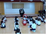 和尚さんをお迎えするにあたり、まずはみんなで「仏のこども」を歌って手を合わせてお祈りをしました。だるま寺さんの様子のスライドをみながら、園長先生より和尚さんの市川先生のご紹介があり、持ってきて下さった大きなだるまさんをみんなの近くにおいて、お話をお聴きしました。市川先生は、子供達からの質問をうけながらお話をすすめられました。「だるまさんは、なぜ丸い形をしているのですか。」「それは、ずっと座って勉強されていたから、丸くなられたのだと思います。」「お顔の下には、どんな字が書いてあるのですか。」「お願いごとの言葉が書かれていることが多いですね。」目の前のだるまさんを倒して、もう一度起き上がる様子をみながら、「倒れそうになっても倒れない、ということで、みんなもそのような頑張るこころが大切ですね。」とお話しをされました。また、「だるまさんが、厳しいお顔をされているのは、皆さんをきちんとみてくださっているから。お父さんやお母さんや先生が怖い顔をしてみんなを叱る時があるかもしれませんが、それもみんなのことを心配しているからです。厳しい顔の大人の人の顔や心を見極めてくださいね。」「お父さん、お母さんや先生達を悲しませることのないように、毎日、自分の健康に気を付けて元気にすごしてくださいね。」とのお話もいただきました。 これらのお話が、子供達にとって、大切な心の糧になれば幸いです。